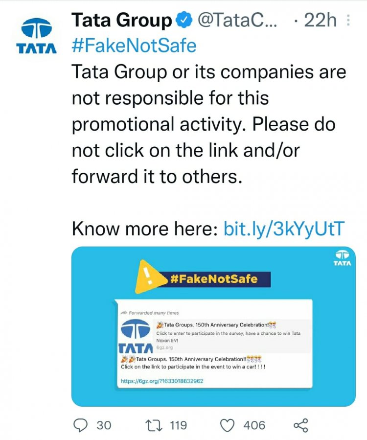 टाटा ग्रुप यांना 150 वर्षे पूर्ण झाली असल्याने "click on the link to participate in the event to win a car" अशा प्रकारचा संदेश सोशल मीडियावर सध्या मोठ्या प्रमाणात व्हायरल होत असून अशा प्रकारची कोणतीही लिन्क प्राप्त झाल्यास संदेशात दिलेल्या लिंक वर क्लिक करू नये. टाटा ग्रुप यांचे मार्फत "टाटा ग्रुप यांना 150 वर्षे पूर्ण झाली असल्याने मोफत कार जिंकण्याची संधी" अशा प्रकारची कोणतीही योजना टाटा ग्रुप यांनी जाहीर केलेली नाही.